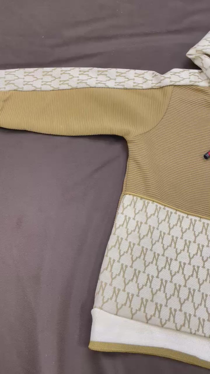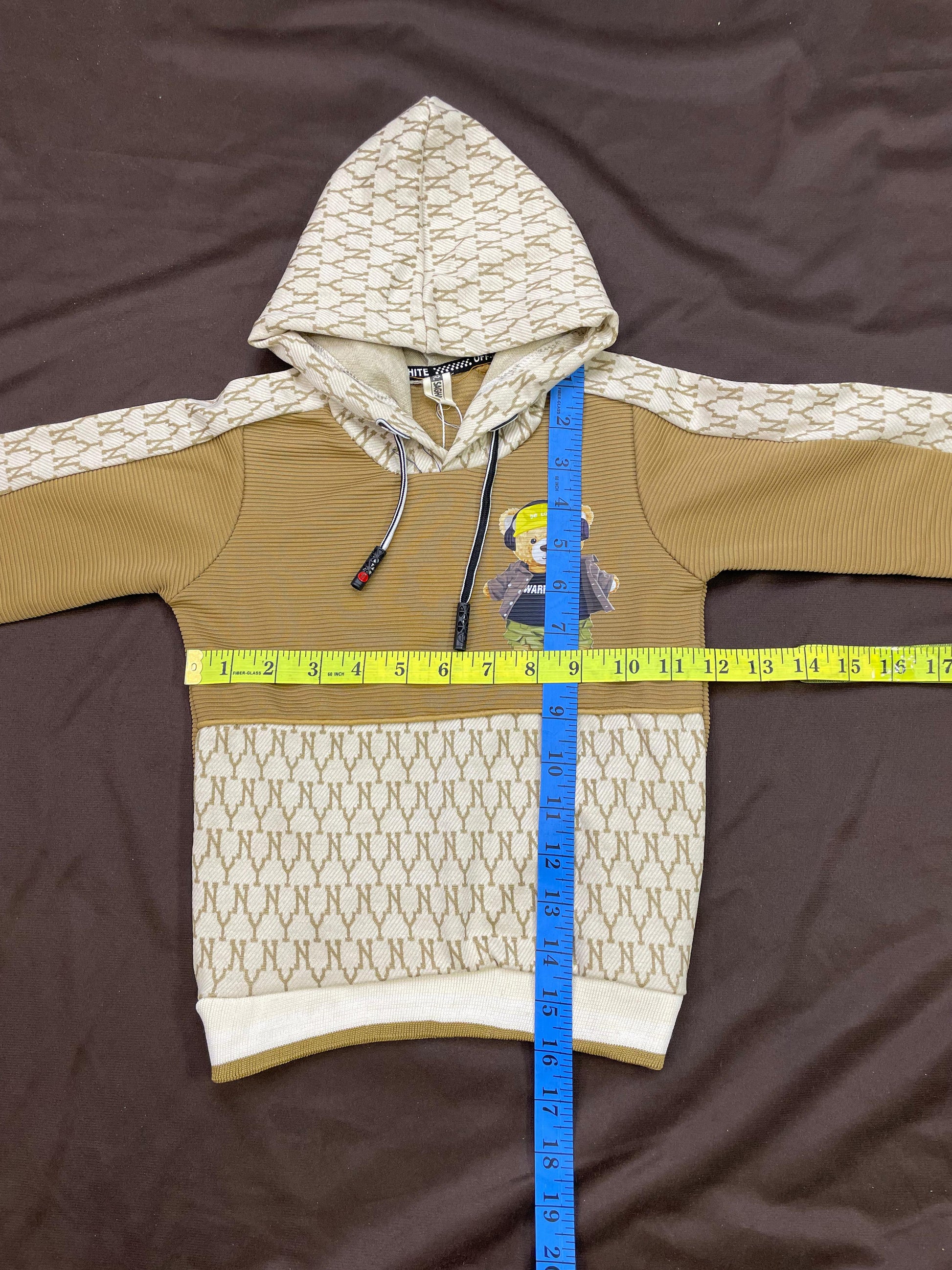 Warm, cute, and easy to style. This beige kids winter hoodie features a patterned hood and hem, soft textured knit, and a friendly bear graphic kids love. Ribbed cuffs and hem keep the fit neat, while quality stitching stands up to everyday play. Pair it with jeans or trousers for school, outings, and weekends.