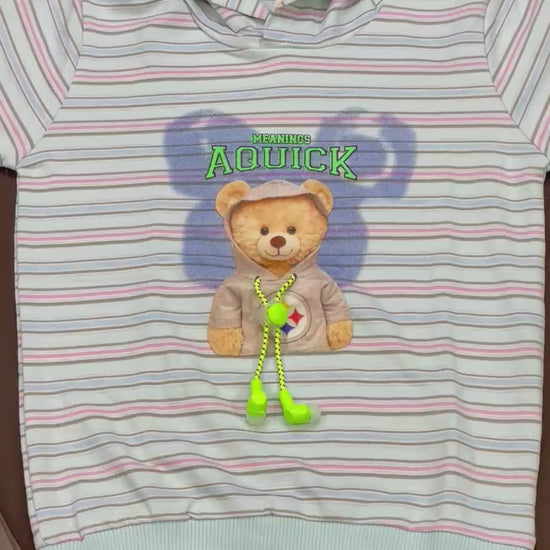 Cute, cozy, and easy to wear. This striped teddy hoodie keeps kids warm without feeling heavy. It features a soft fleece feel inside, ribbed cuffs and hem for a snug fit, and a playful teddy applique that little ones love. The neutral light Blue base with pastel stripes pairs well with any bottoms, so it’s perfect for school, play, and weekend outings.